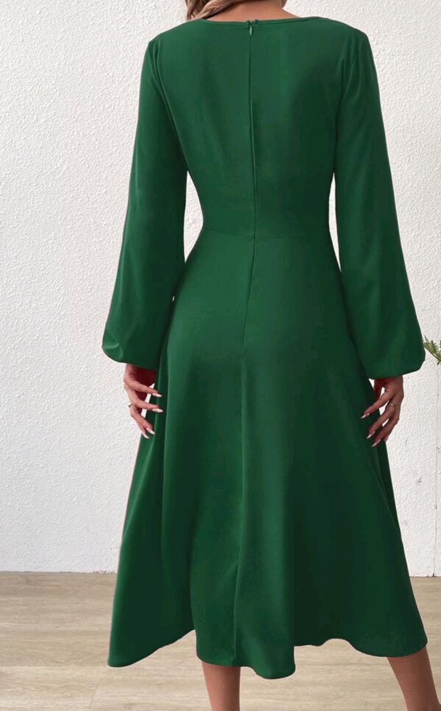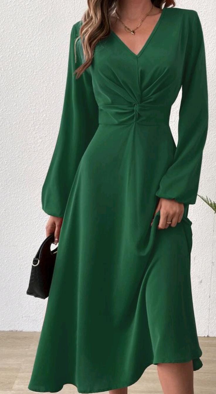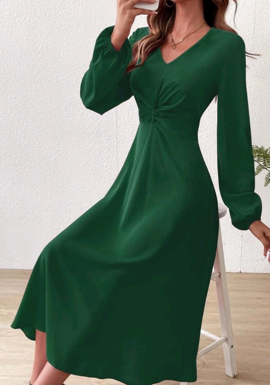 Vestido midi com manga longa bufante, decote em V e detalhe de nó torcido no centro do busto, que valoriza a cintura e traz charme e sofisticação ao visual.